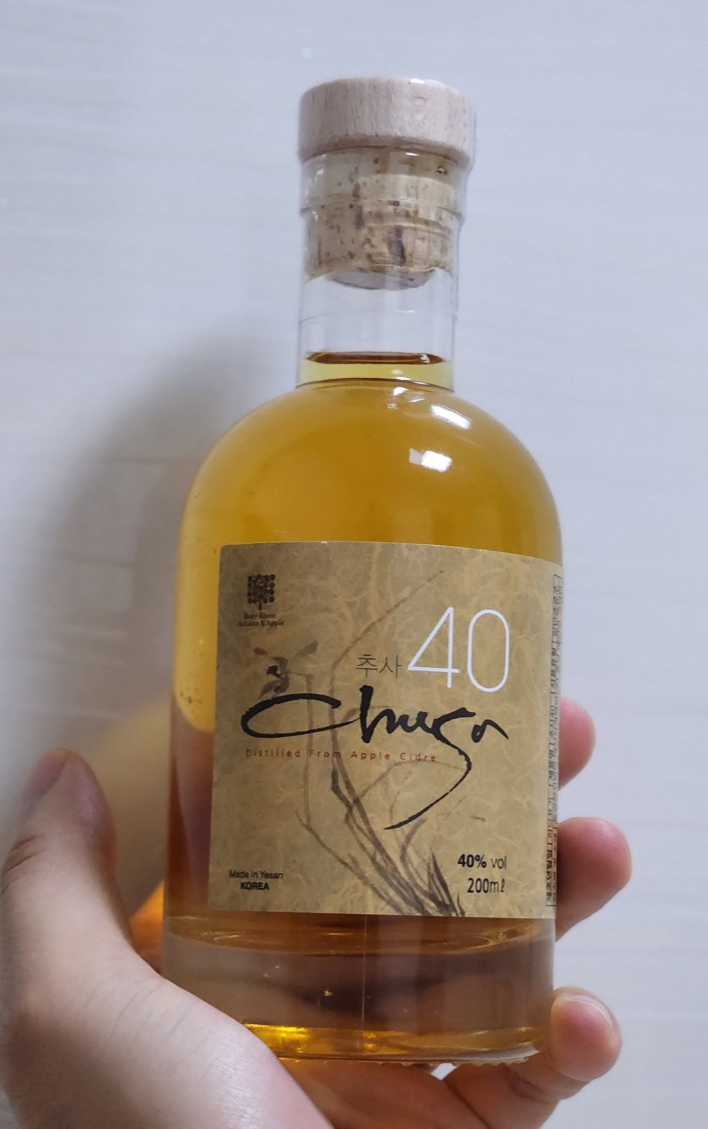 - 추사 40은 사과와인으로 유명한 예산사과와인 에서 만들어지며, 당연하게도 사과를 원료로 한 증류주로, 깊은 향과 부드러운 맛이 특징입니다. 한국 전통의 소주나 과실주와는 달리, 추사40은 사과의 달콤한 향과 동시에 증류주 특유의 깔끔하고 강한 느낌을 함께 제공합니다. 또한 최근 전통주에서 유행시키고 있는 오크통에서 숙성한 것도 특징입니다. 40도의 알코올 도수는 일반적인 증류주와 비슷한 수준이지만, 특유의 부드러움과 향기로운 과일 향 때문에 다양한 상황에서 즐길 수 있습니다. 추사40은 한국 전통주에 관심이 있는 분들에게 추천할 만한 제품입니다.