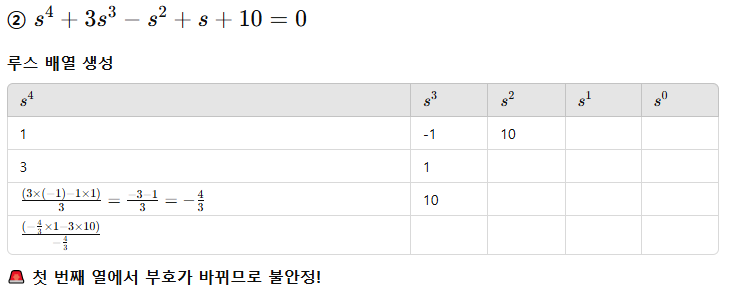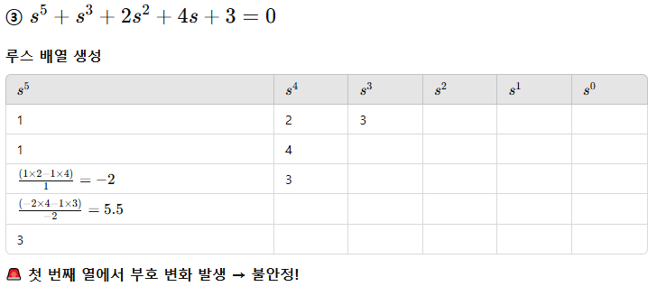 불안정한 시스템: 하나라도 오른쪽 반평면(실수부가 양수)에 근이 존재하면 시스템은 불안정합니다.