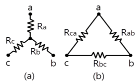 67. 그림 (a)의 Y결선 회로를 그림 (b)의 △결선회로로 등가 변환했을 때 Rab, Rbc, Rca는 각각 몇 Ω 인가? (단, Ra = 2Ω, Rb = 3Ω, Rc = 4Ω)