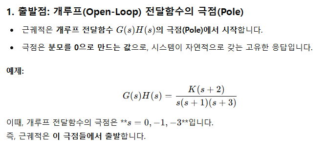 - 맞는 설명입니다. 근궤적은 개루프 전달함수의 극점(Open-loop poles)에서 시작하며, 폐루프 시스템의 극점이 어떻게 변화하는지 보여줍니다.