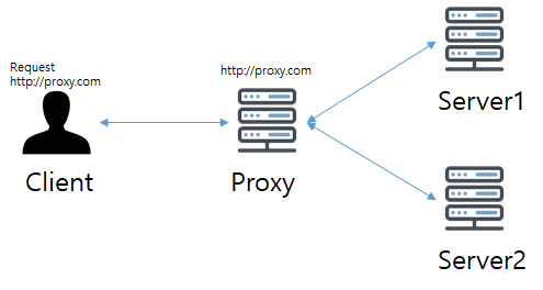 - 클라이언트가 프록시에 요청을 하면, 프록시가 해당 요청을 적절한 서버에 요청하여 응답을 받아 전달해주는 형태