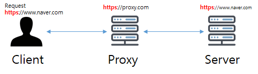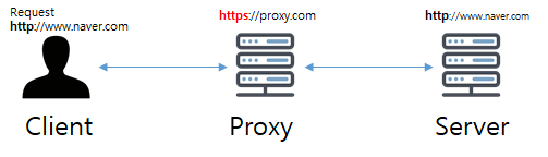 - 클라이언트가 서버에 직접 요청을 하는 것이 아닌, 프록시 서버가 해당 요청을 받아 클라이언트가 요청한 서버에 프록시가 대신 요청하여 응답을 받아 전달해주는 형태