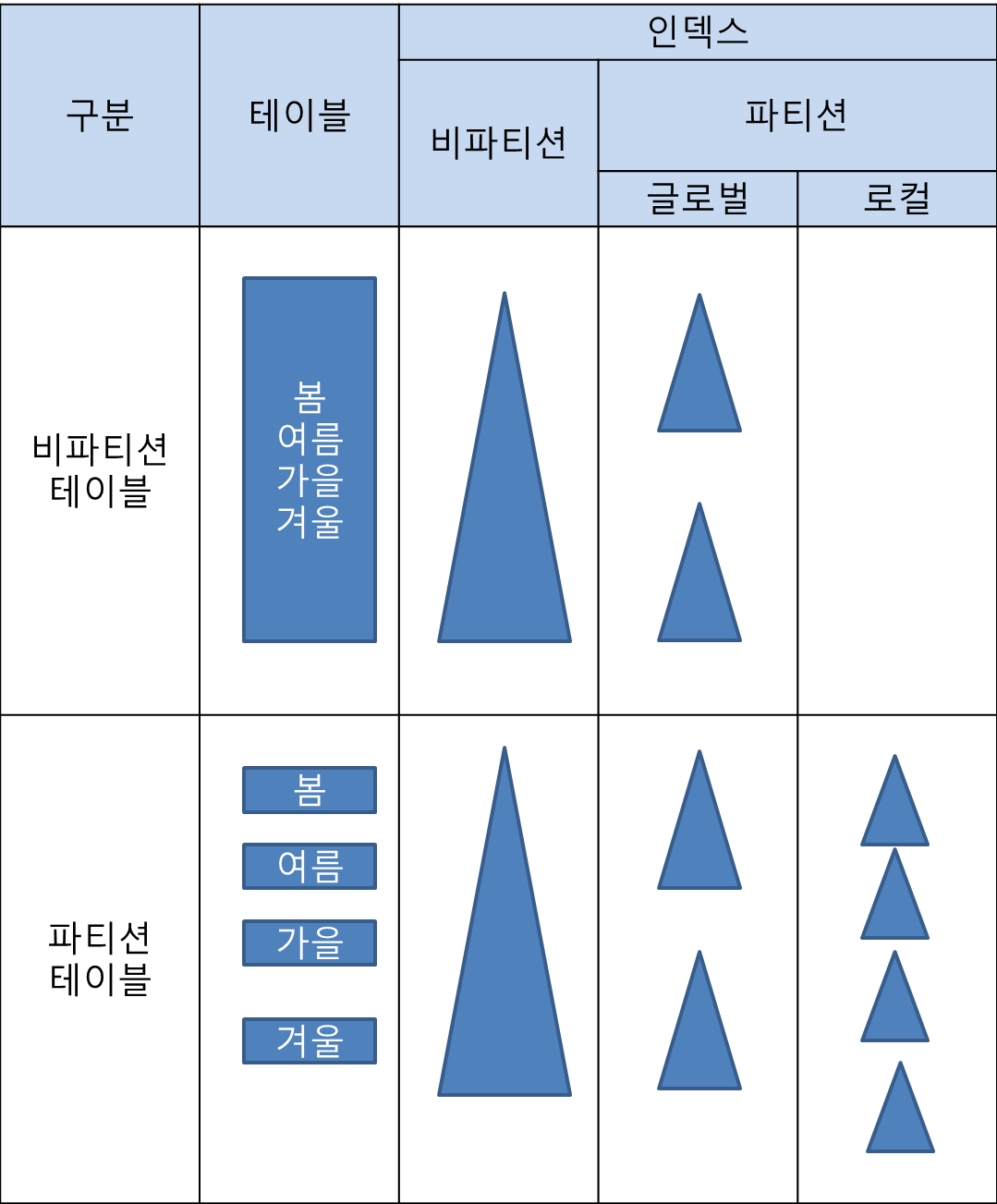 - 테이블 파티션의 키가 '계절'이라면 인덱스 파티션의 키도 '계절'이다.